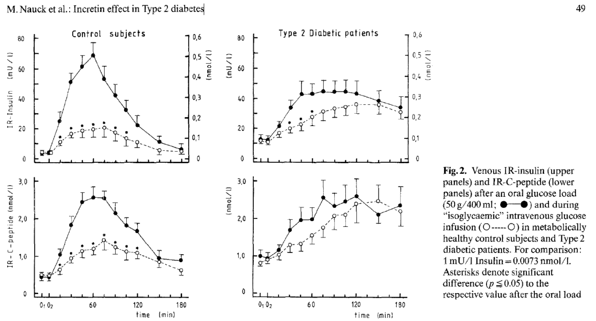 and an "isoglycaemic" intravenous glucose infusion, respectively, were measured in 14 Type 2 (non-insulin-dependent) diabetic patients and 8 age- and weight-matched metabolically healthy control subjects. Differences between responses to oral and intravenous glucose administration are attributed to factors other than glucose itself (incretin effect) [3].