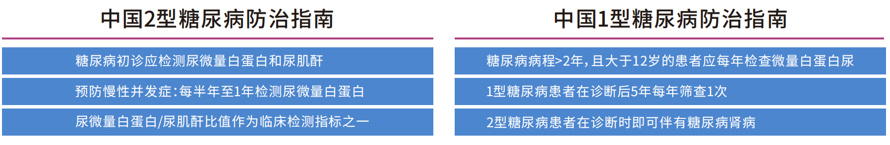 推薦診斷指標(biāo):隨機尿測定UACR(尿白蛋白/肌酐比值);推薦所有T2DM患者和病程5年以上的1型糖尿病患者每年應(yīng)至少進(jìn)行1次UACR檢測,以便早期發(fā)現(xiàn)DKD。