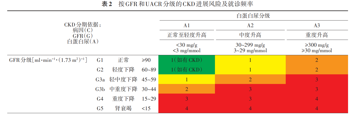 注:GFR為腎小球濾過率;UACR為尿白蛋白/肌酐比值;CKD為慢性腎臟?。槐砀裰械臄?shù)字為建議每年復(fù)查的次數(shù);背景顏色代表CKD進(jìn)展的風(fēng)險:綠色為低風(fēng)險,黃色為中風(fēng)險,橙色為高風(fēng)險,紅色為極高風(fēng)險。