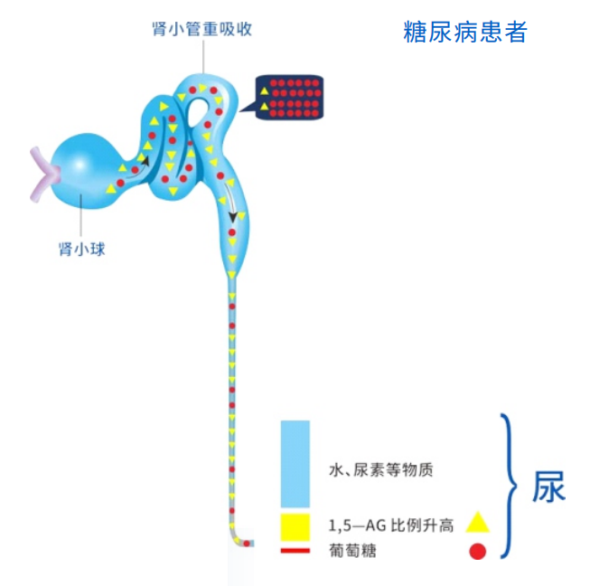 (2)1,5-AG與葡萄糖在腎小管內競爭性重吸收。正常?尿液中1,5-AG含量少,血液中濃度相對穩(wěn)定。