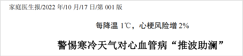 相關(guān)數(shù)據(jù)顯示,氣溫每降低1℃,心腦血管疾病發(fā)生風險則增加2%。其中女性、老年人(≥65歲)相較于男性和年輕人而言,更容易發(fā)生心腦血管疾??;此外非供暖地區(qū)發(fā)生的風險遠高于供暖地區(qū)。尤其是對于合并了其他慢性疾病的患者而言,發(fā)生的風險更大,更加需要防護....