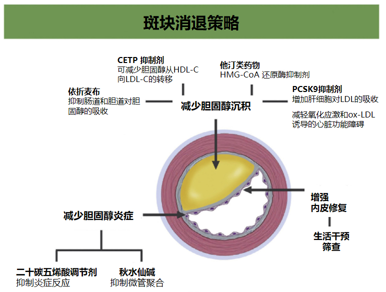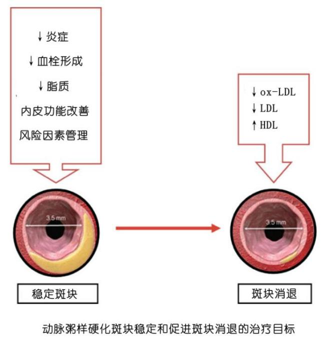 斑塊逆轉(zhuǎn)不僅在于動脈管腔和斑塊大小的改變,更在于動脈粥樣硬化形成的每一步中,是斑塊形態(tài)學(xué)和組成成分的共同改變,是斑塊從較容易破裂的表現(xiàn)型,向較不容易破裂的表現(xiàn)型發(fā)展的一個過程。