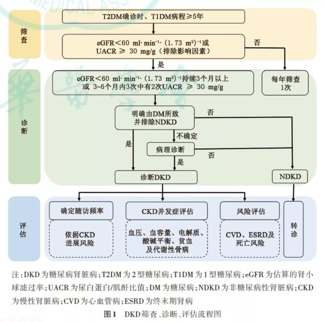 推薦病程5年以上的1型糖尿病患者及T2DM患者在確診時就應(yīng)進行UACR 檢測和eGFR 評估以早期發(fā)現(xiàn)DKD,以后每年應(yīng)至少篩查1次。成本?效益分析顯示,在新診斷的T2DM患者中進行DKD篩查可節(jié)省醫(yī)療費用。