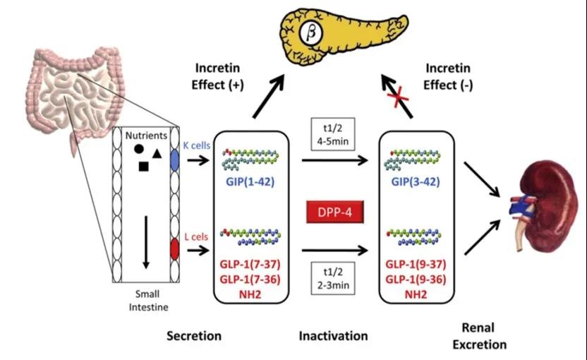 腸促胰素肽(Incretin peptides)[4]是進食后由腸道的內分泌細胞分泌的激素,促進機體產(chǎn)生適當?shù)牟秃笠葝u素分泌。